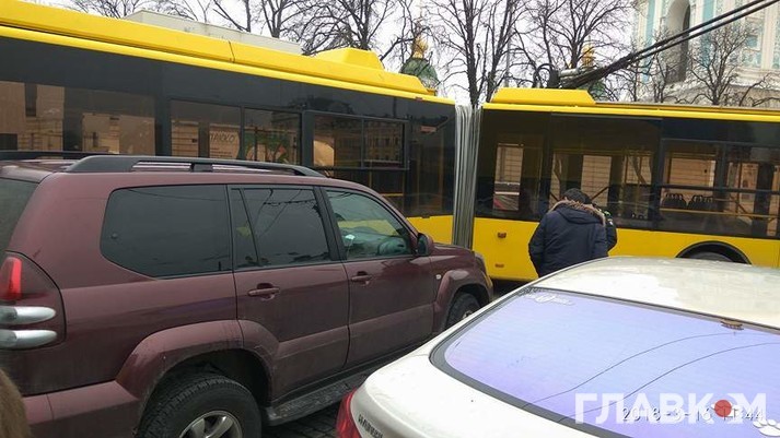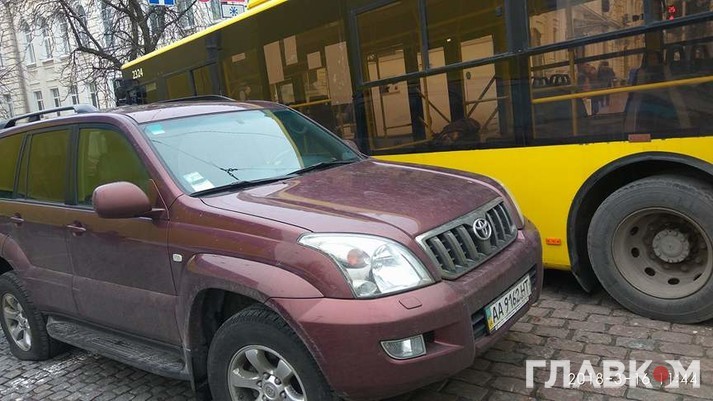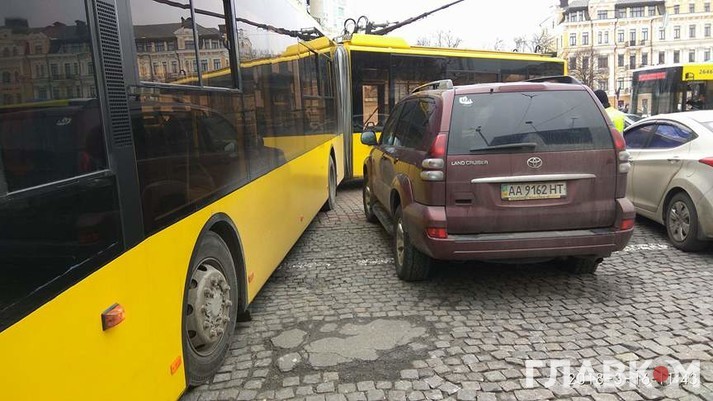 У центрі Києва заблоковано рух транспорту в районі Софійської площі через припаркований посеред дороги джип.