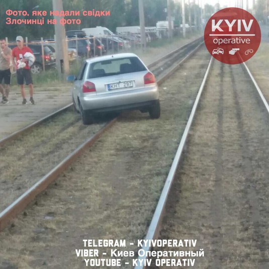 Нагадаємо, ранком середи Audi (іноземна реєстрація) у Києві на перехресті Милославської та Маяковського збили пішохода та, втікаючи з місця ДТП, не впорались з керуванням і виїхали на трамвайні колії. Винуватці покинули авто і втекли.