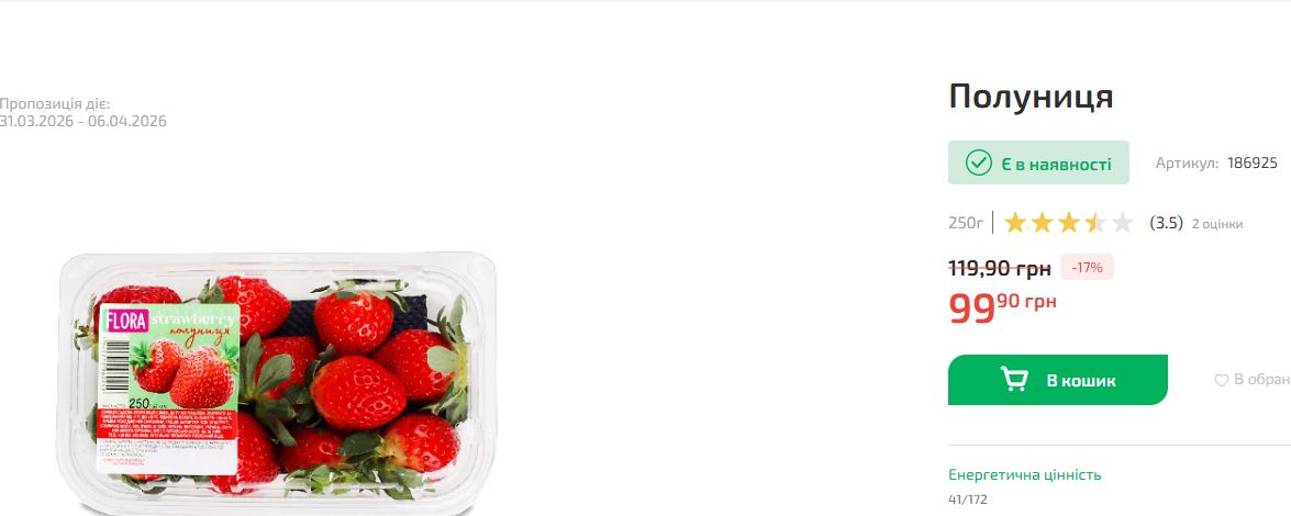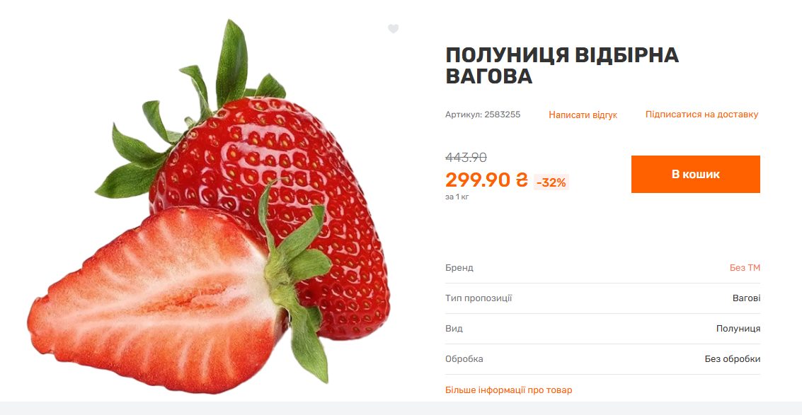 У великих торговельних мережах ціни на ягоду значно вищі. Мережа Varus пропонує відбірну полуницю за ціною 299,90 грн за кілограм.