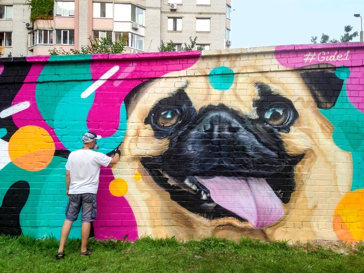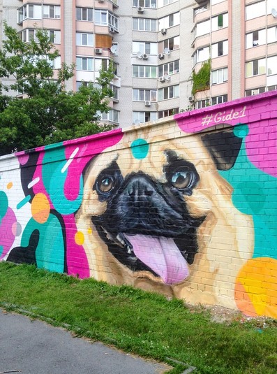 У Дарницькому районі Києва, на Позняках, у дворі одного з будинків зявився мурал із яскравим зображенням собаки породи мопс. Створив його відомий київський художник Віталій Гідеван.