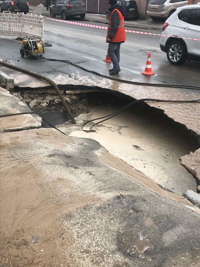 Витік води на місці аварії вже ліквідували. Від тиску великої кількості води провалився асфальт, повідомляє «Київ медіа».