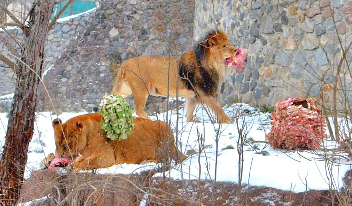 «У зоопарку проживають африканські леви, які на добу з’їдають близько 29 кг м’яса. Щоденно відділ хижих тварин створює різноманітні забавки та іграшки для того, щоб збагатити середовище. А відвідувачі можуть на власні очі побачити, як леви нашого прайду спілкуються між собою», – зауважили в Київському зоопарку.