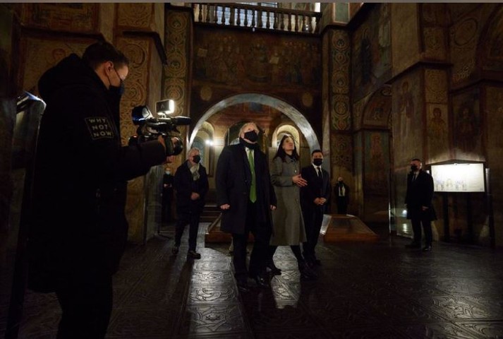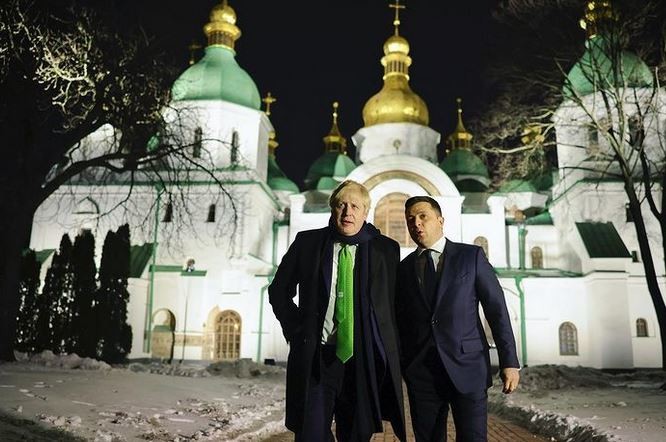 Прем'єр Великої Британії Борис Джонсон, після офіційних зустрічей у Києві, ввечері 1 лютого прогулявся нічним містом, зокрема відвідав Національний заповідник «Софія Київська». Компанію йому склав президент України Володимир Зеленський. Фото вечірньої прогулянки опублікував Офіс президента.