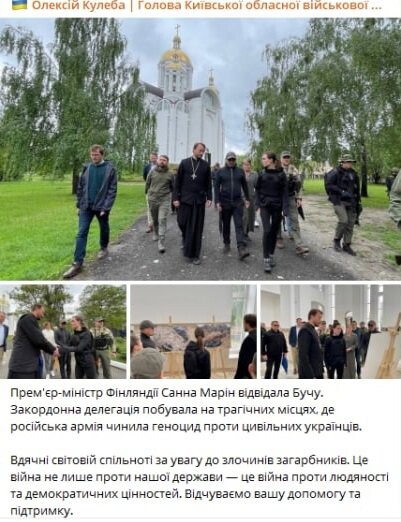 Також Санна Марін відвідала зруйновану російськими загарбниками Бучу на Київщині. Про це повідомив голова Київської ОВА Олексій Кулеба у Telegram.
