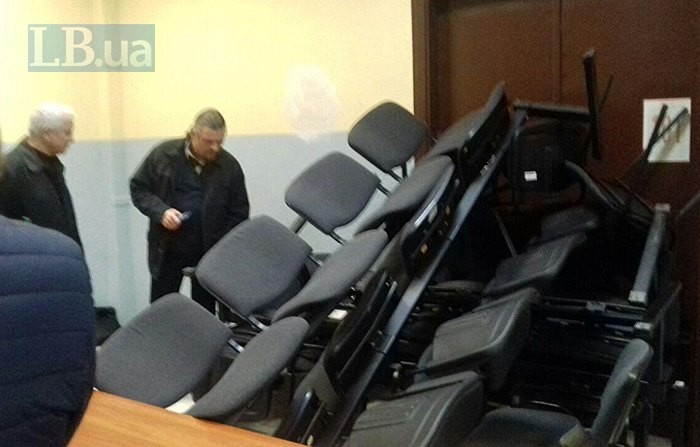 Учасники судового засідання забарикадувалися зсередини стільцями.