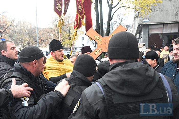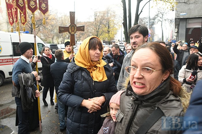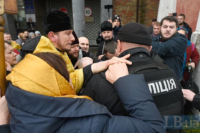 Як повідомляє LB.ua, з криками «Ми вимагаємо правосуддя» вони розбили скло вхідних дверей, намагаючись потрапити на засідання, де розглядають питання, пов'язані з ліквідацією церкви.