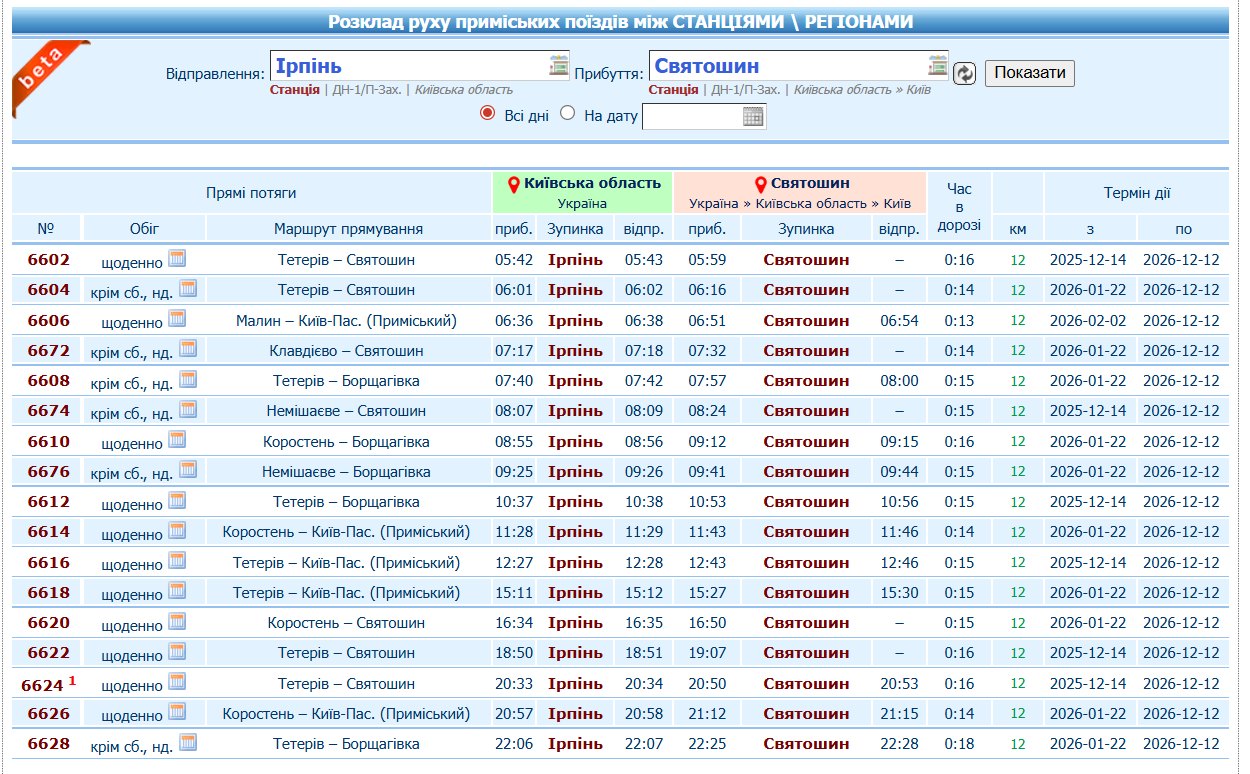 Зауважимо, що окрім автотранспорту, дістатися до Києва можна приміськими поїздами. Зокрема, до станції Київ-Пасажирський курсують електрички: