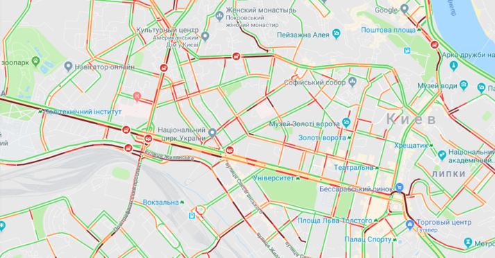 Як свідчать онлайн-карти Google, наразі дуже повільно рухаються автомобілі біля станцій метро «Хрещатик», «Майдан Незалежності», «Тараса Шевченка», «Контрактова площа», «Дружби народів», «Либідська», «Палац Україна», «Олімпійська», «Університет», «Театральна», «Золоті ворота», «Кловська .