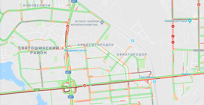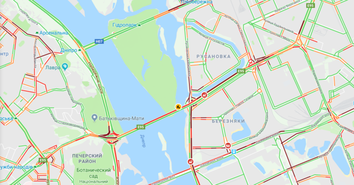 Затори спостерігаються також на Подолі, Набережному шосе, бульварі Дружби народів, бульварі Лесі Українки, проспекті Перемоги.