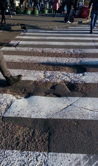Проте, крім цієї ями, на площі ще багато інших невеликих ям на тротуарах, які місцями наповнені водою. Вони є справжньою перешкодою для пасажирів з сумками.
