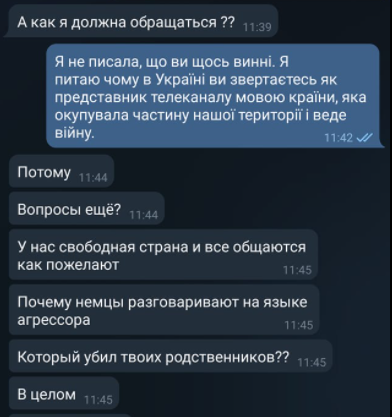 Аргументом звернення російською було те, що Україна є вільною та кожен може спілкуватися тією мовою, якою забажає. До того ж, у приклад вона навела Німеччину. Зрештою, діалог закінчився тим, що кастинг-менеджерка облаяла дівчину. Також представниця медіа просила відправляти інтимні фото та представлялася не лише менеджером каналу, а й адміністратором чату з кастингом у Telegram.