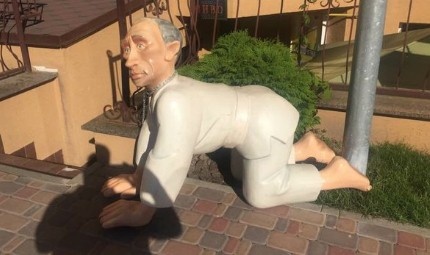 На Борщагівці з'явилася скульптура президента РФ на ланцюгу та на колінах.