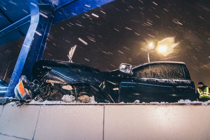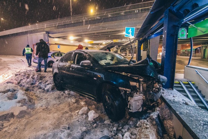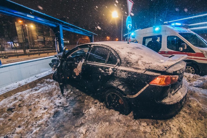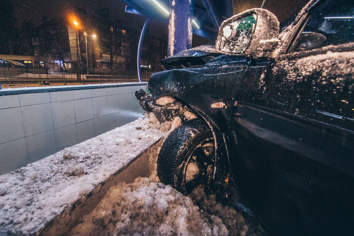 У вівторок, 12 лютого, у Києві на перетині проспекту Космонавта Комарова і бульвару Вацлава Гавела сталася аварія за участю автомобіля Mitsubishi Lancer: водій не впорався з керуванням і влетів у підземний пішохідний перехід.