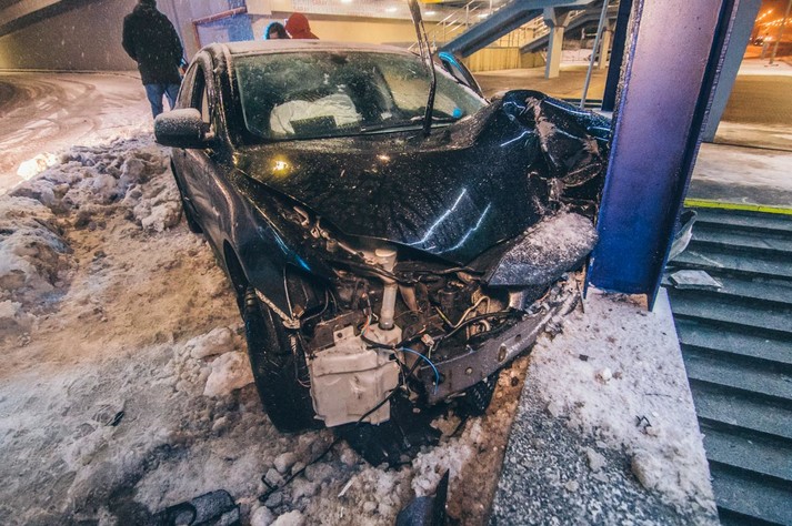 Автомобіль отримав серйозні пошкодження передньої частини від зіткнення з опорою переходу.
