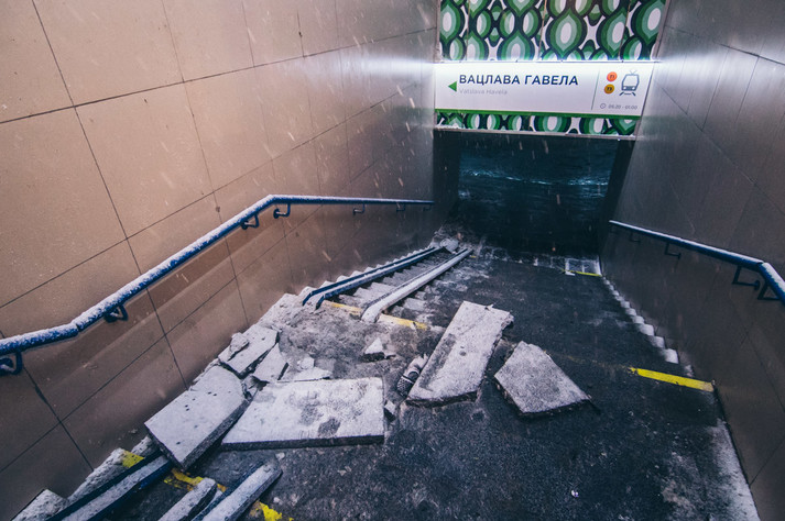Вхід в підземний пішохідний перехід також був пошкоджений зіткненням з автомобілем. Від удару облицювальні плити впали на ступені переходу.