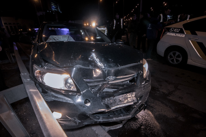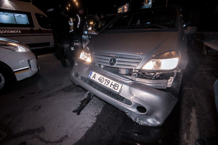 У ніч на середу, 27 березня, в Києві на перетині вулиці Теодора Драйзера і проспекту Володимира Маяковського сталася ДТП за участю двох машин. П'яний водій Toyota намагався втекти від поліції і врізався в автомобіль Mercedes.