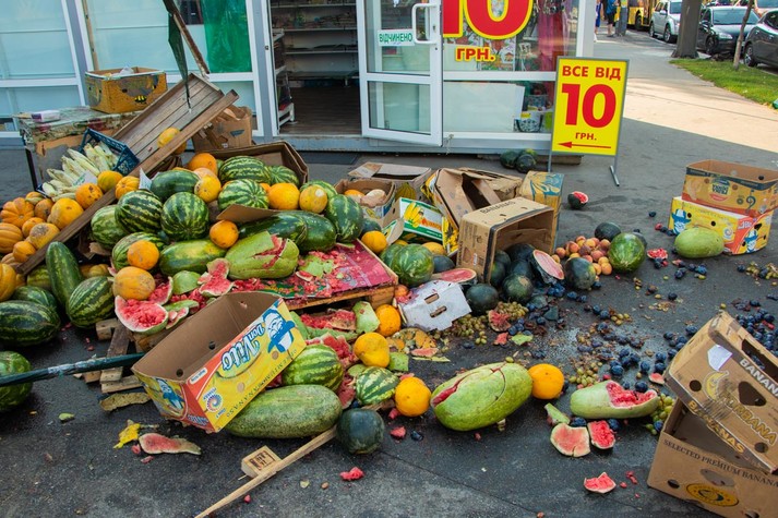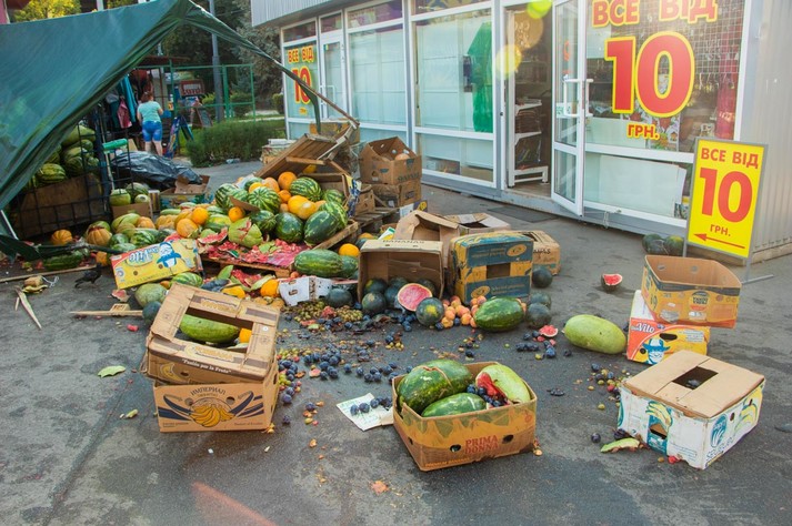У понеділок, 12 серпня, увечері в Солом'янському районі Києва сталася масова ДТП: біля Солом'янського ринку п'яний чоловік на Nissan Micra зніс намет з кавунами, вдарив чотири автомобілі і зупинився в дереві.