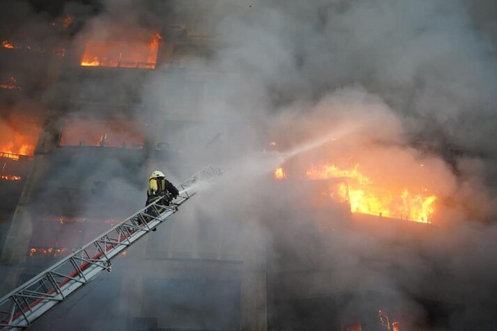 За інформацією ДСНС 15 березня у Святошинському районі Києва, внаслідок влучання боєприпасу в дев’ятиповерховий житловий будинок, сталося незначне пошкодження будинку з подальшими незначними локальними загораннями на. «О 05:36 загорання локалізовані. Від ДСНС залучено 10 осіб та п’ять одиниць техніки.