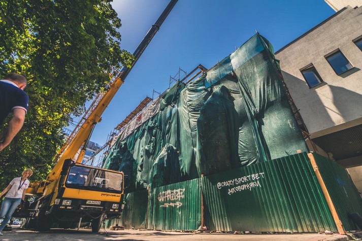 Будівельники практично повністю розібрали старий фасад будівлі, повідомляє «Інформатор». Одночасно над реконструкцією кінотеатру працюють три крани і десятки робочих всередині.