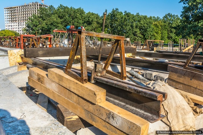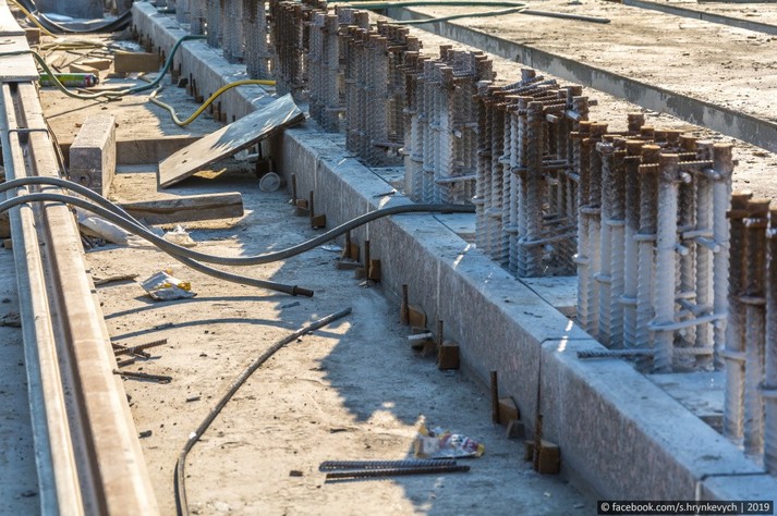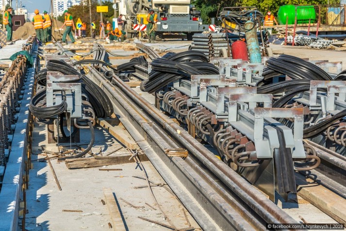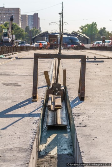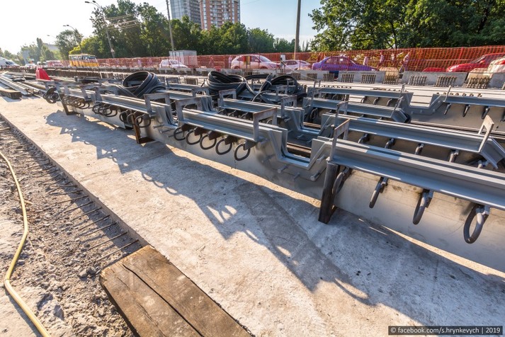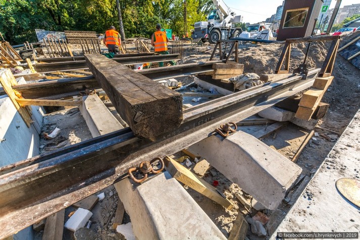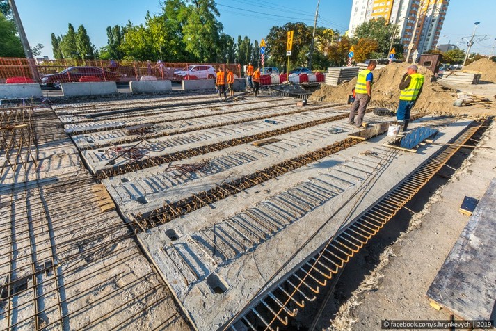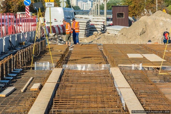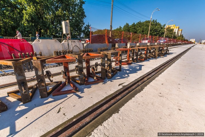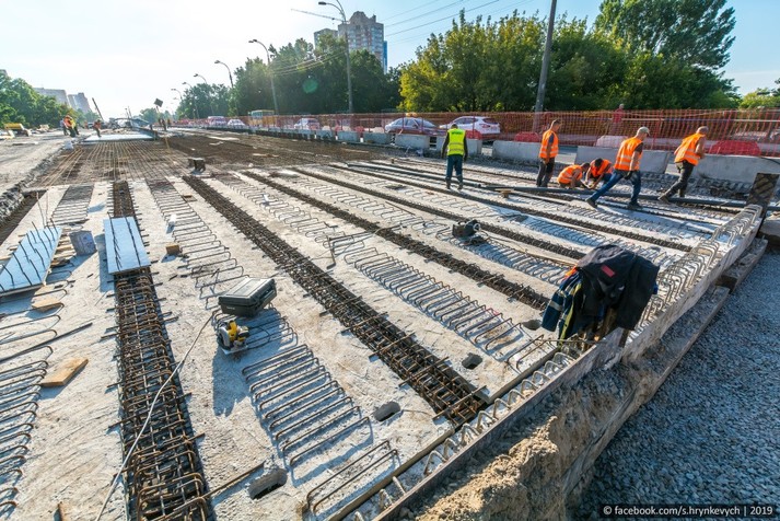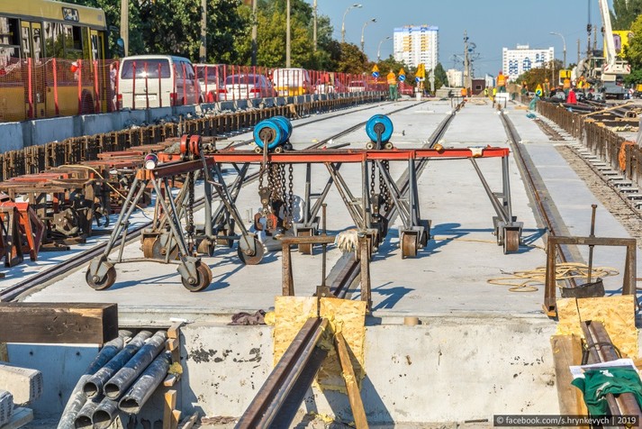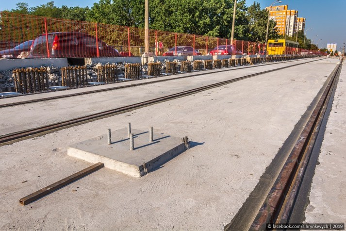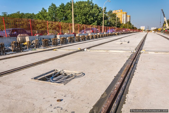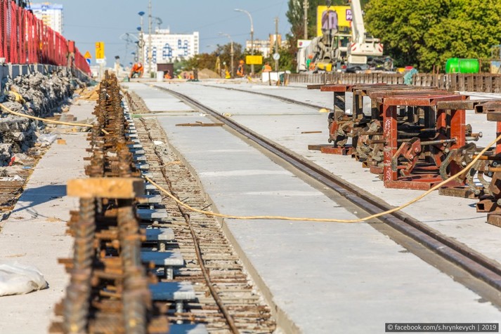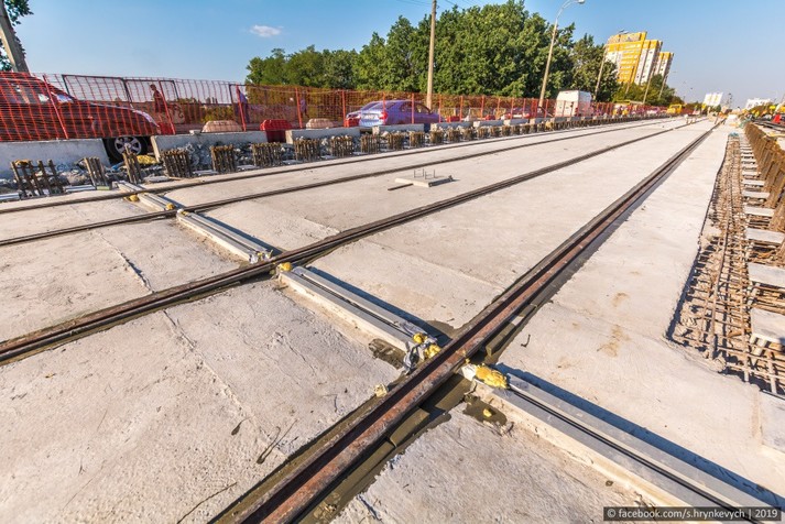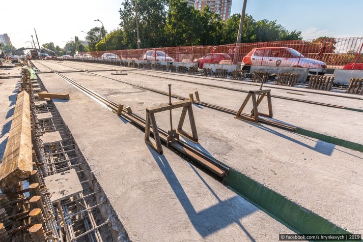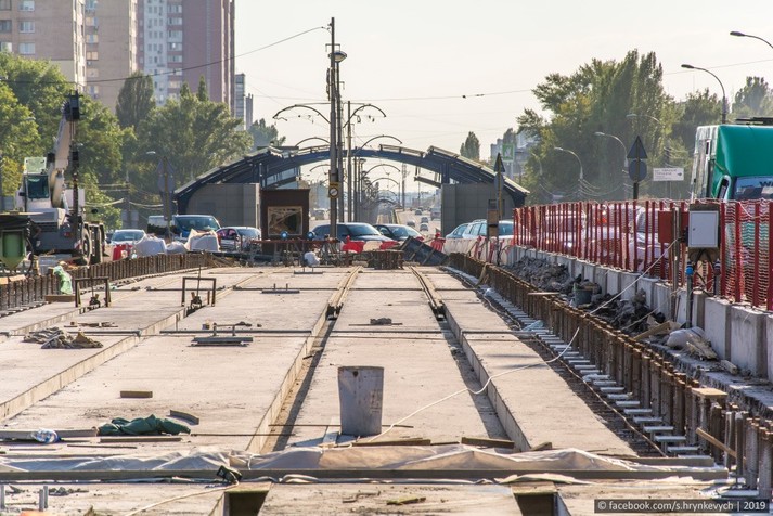 На сьогодні там готове більше половини монолітної основи трамвайної колії, змонтовано половину рейкового полотна, замінені аварійні балки трамвайної частини шляхопроводу. Про це повідомив блогер Сергій Гринкевич на своїй сторінці у Facebook.