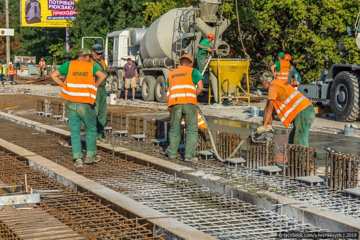 На прольотах шляхопроводу в'яжуть арматурні каркаси і заливають бетон.