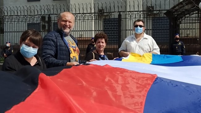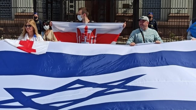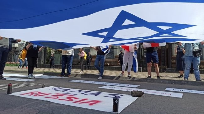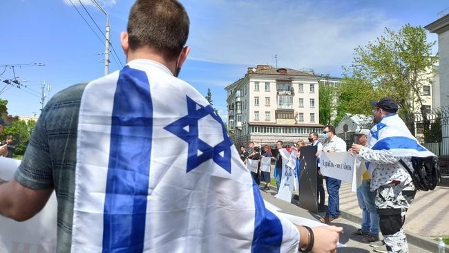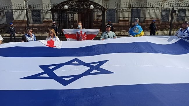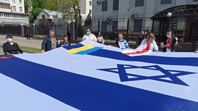 У неділю, 16 травня, під посольством Російської Федерації в Києві розпочався мітинг солідарності з Ізраїлем. Про це з місця події повідомляє кореспондент Цензор.НЕТ.
