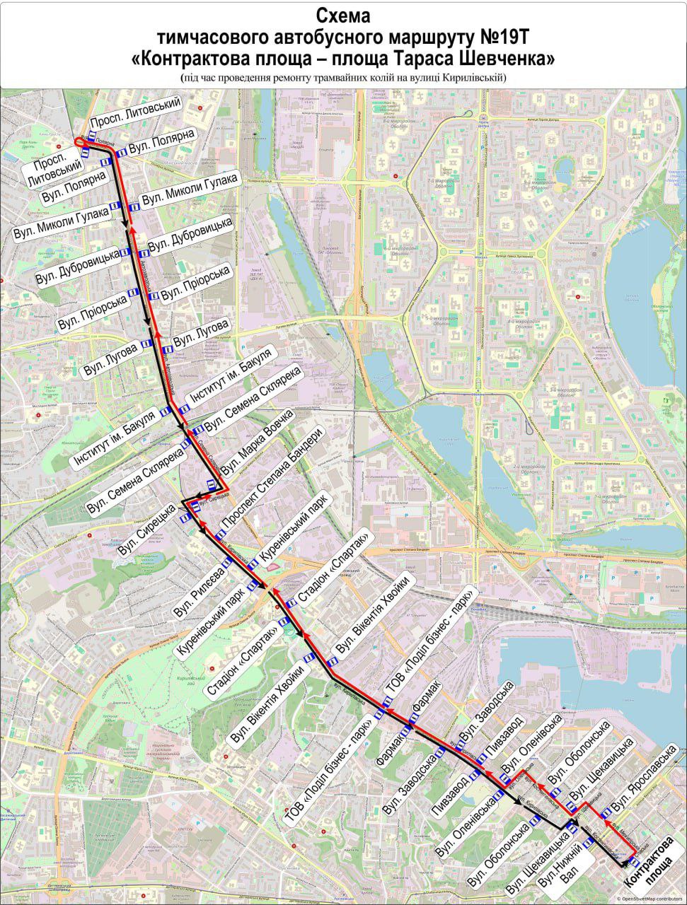 Також додатково працює тимчасовий автобусний маршрут № 19-Т. Він курсуватиме від Контрактової площі до площі Тараса Шевченка за схемою: вул. Спаська – вул. Межигірська – вул. Щекавицька – вул. Костянтинівська – вул. Оленівська – вул. Кирилівська – вул. Сирецька – вул. Семена Скляренка – вул. Автозаводська – вул. Полярна до площі Тараса Шевченка.