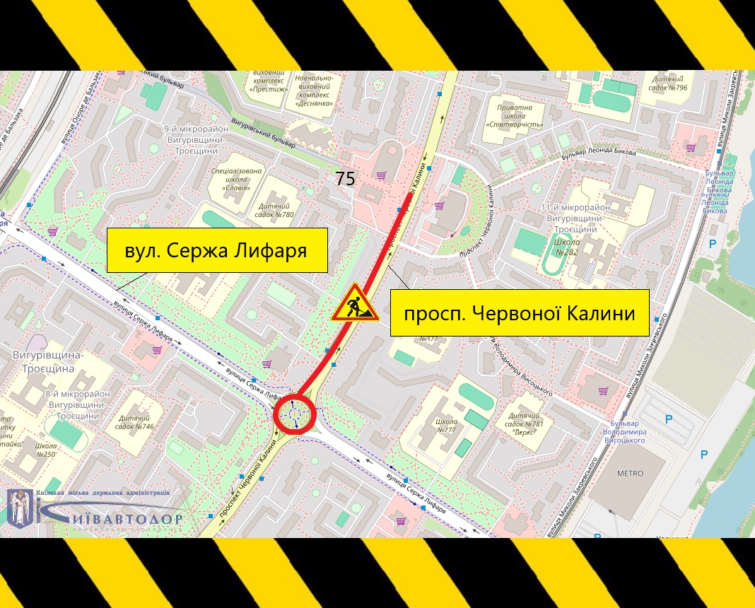Із 7 квітня на ділянці проспекту Червоної Калини у Києві від будинку № 75 до транспортної розв’язки з вулицею Сержа Лифаря частково обмежено рух транспорту. Про це повідомляє «Главком» із посиланням на «Київавтодор».