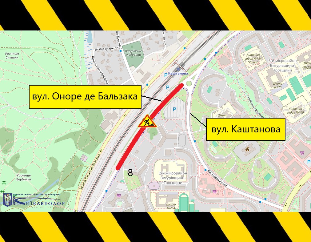 Повідомляється, що у період із 9:00 до 18:00 працівники ШЕУ Деснянського району ремонтуватимуть асфальтобетонне покриття на ділянці від вулиці Каштанової до будинку № 8 на вулиці Оноре де Бальзака.