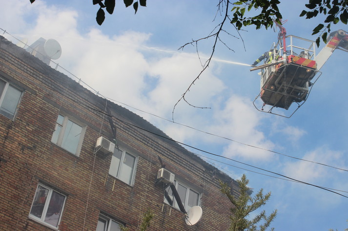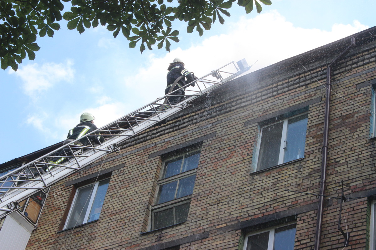 На місці події рятувальниками встановлено, що горить покрівля 5-ти поверхового житлового будинку на площі 1200 кв. м.
