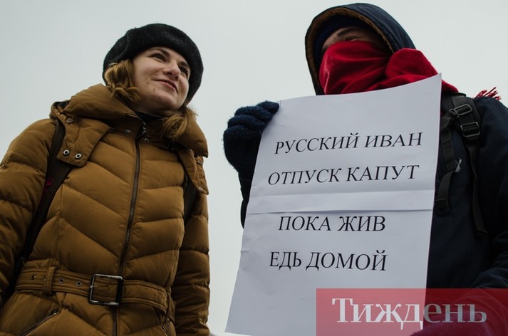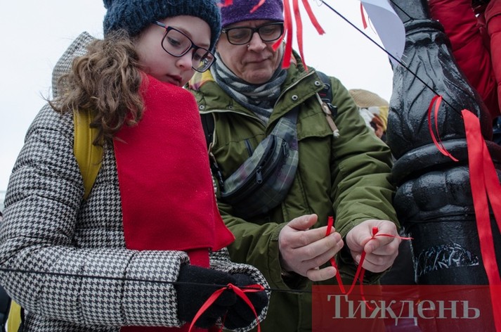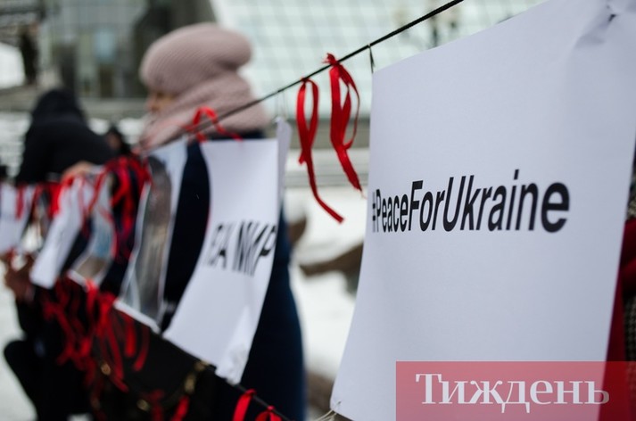Учасники акції закликали Росію припинити агресію на сході України, розвісили антивоєнні плакати та червоні стрічки, які символізували підтримку українських військових на Донбасі.