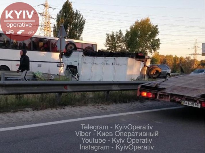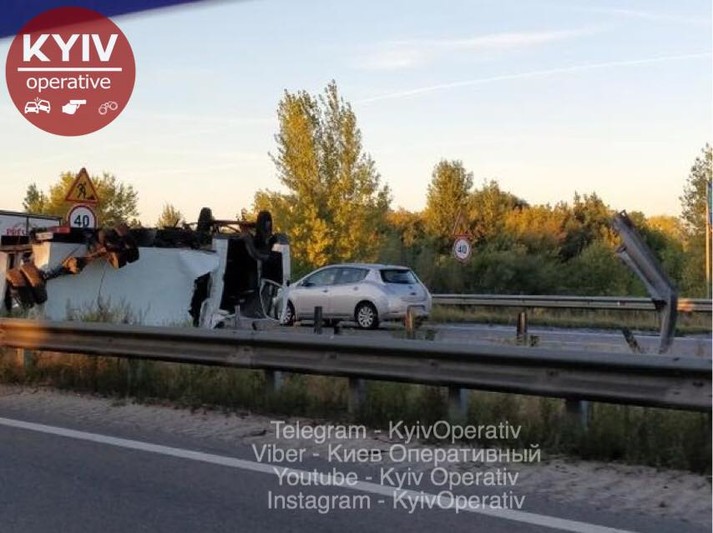 Як повідомляє dtp.kiev.ua, час перекидання вантажівка знесла близько 30 м відбійника.
