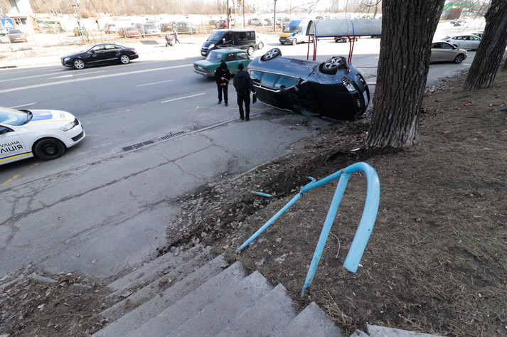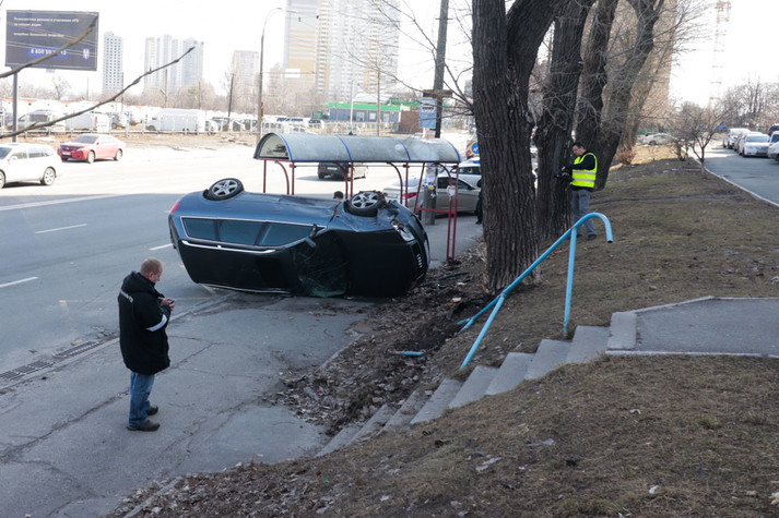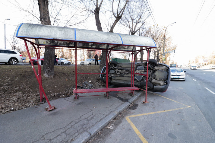 У четвер, 7 березня, в Києві на перетині проспекту Науки і вулиці Ракетної сталася серйозна ДТП: зіткнулися Chevrolet і Audi, в результаті чого остання вилетіла на тротуар, знесла зупинку громадського транспорту і перекинулася.