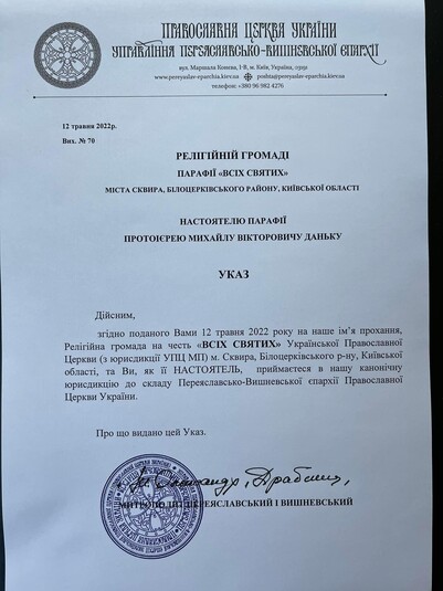 12 травня до Переяславсько-Вишневськоі єпархії Православної церкви України доєдналася громада парафії Всіх Святих міста Сквира з Білоцерківщини. Громада приєдналась до ПЦУ на чолі з настоятелем – протоієреєм Михайлом Михайло Данько. Про це повідомив митрополит Православної церкви України Олександр Драбинко.