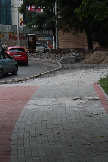 Навколо моста, що будується, почали облагороджувати територію. На з'їзді з проспекту Перемоги в бік вулиці Олександра Довженка викладають велодоріжку червоно-білою плиткою.