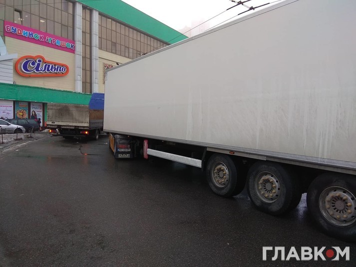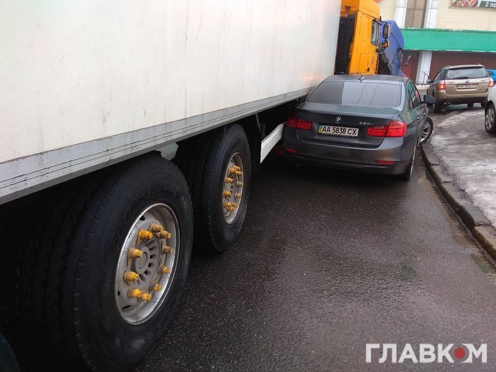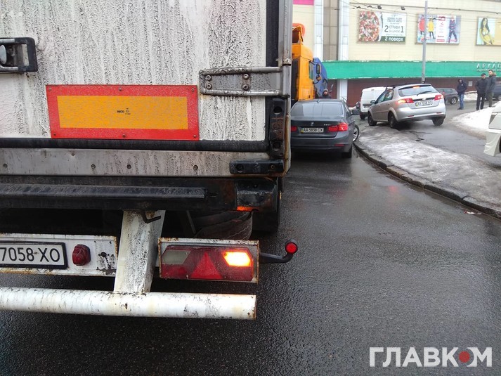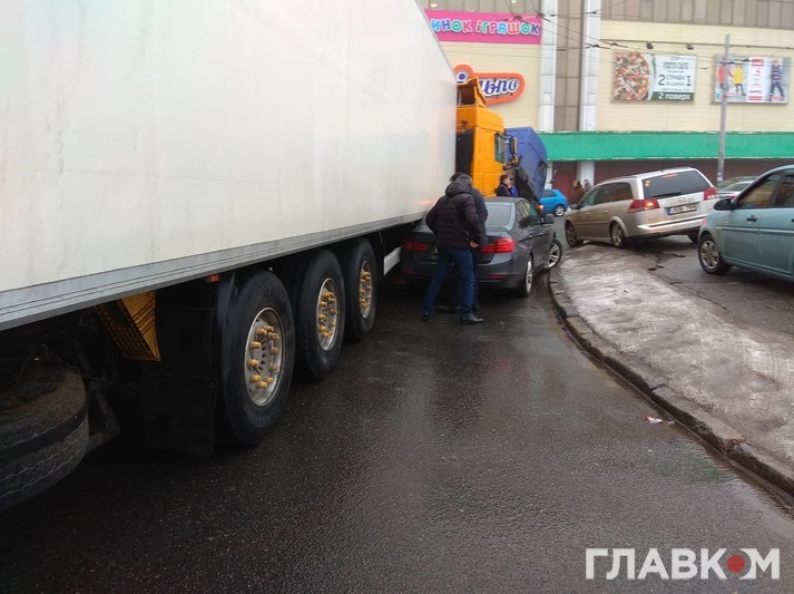 Сьогодні, 1 лютого, близько 14:30 на Індустріальному мосту у Києві сталася ДТП за участі легкового автомобіля BMW і вантажівки DAF.