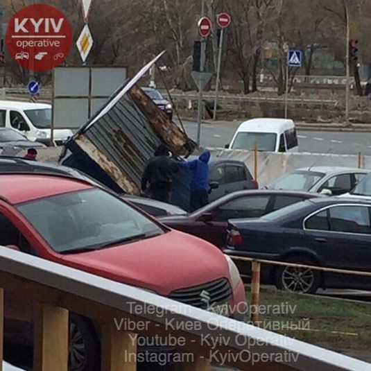 За даними «Києва оперативного», на Саперно-Слобідській, 10, здуло залізну конструкцію і вітром віднесло на припарковані авто.