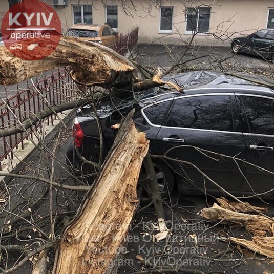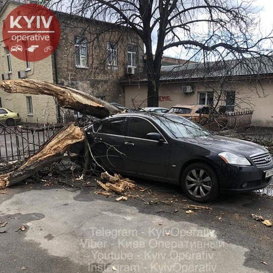 У Коцюбинському, що поблизу Києва, сильний вітер повалив на дорогу дерево, яке пошкодило автівку.
