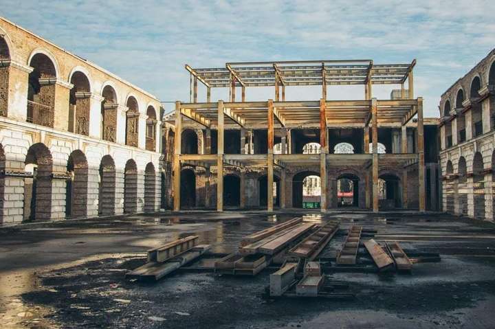 Гостиний двір стоїть без даху, вікон і штукатурки ще з зими 2013 року і продовжує потроху руйнуватися.