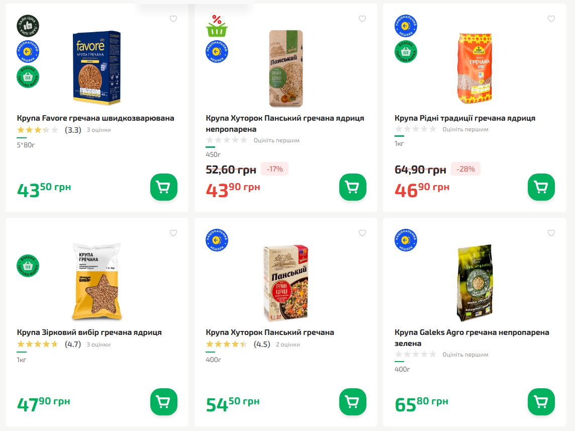 У цій мережі представлено широкий вибір гречки від бюджетних варіантів до преміального органічного сегмента.