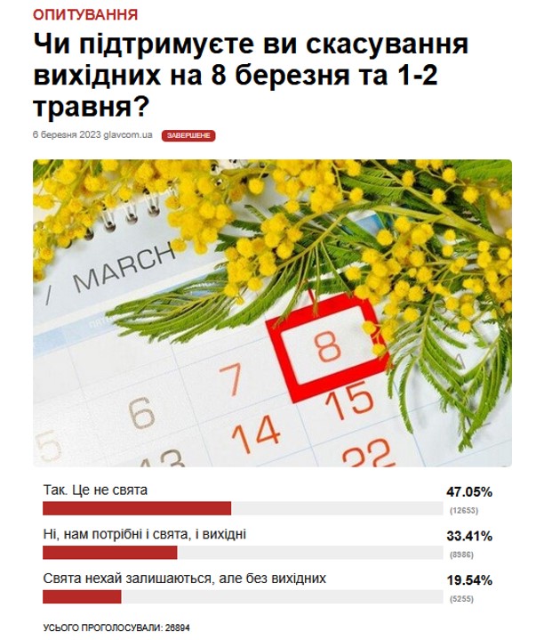 Нагадаємо, у лютому 2023 року на розгляд Верховної Ради подали законопроєкт №9009, який пропонував скасувати 8 березня, 1 травня та 9 травня, а замість них започаткувати три нові свята: 25 лютого – «День української жінки» (це, нагадаймо, дата народження Лесі Українки); 9 березня – день народження Тараса Шевченка; друга неділя травня – «День матері». Тоді ж омбудсмен Верховної Ради з прав людини Дмитро Лубінець став на захист 8 березня, а на сайті президента з’явилися одразу кілька петицій проти скасування вихідного.