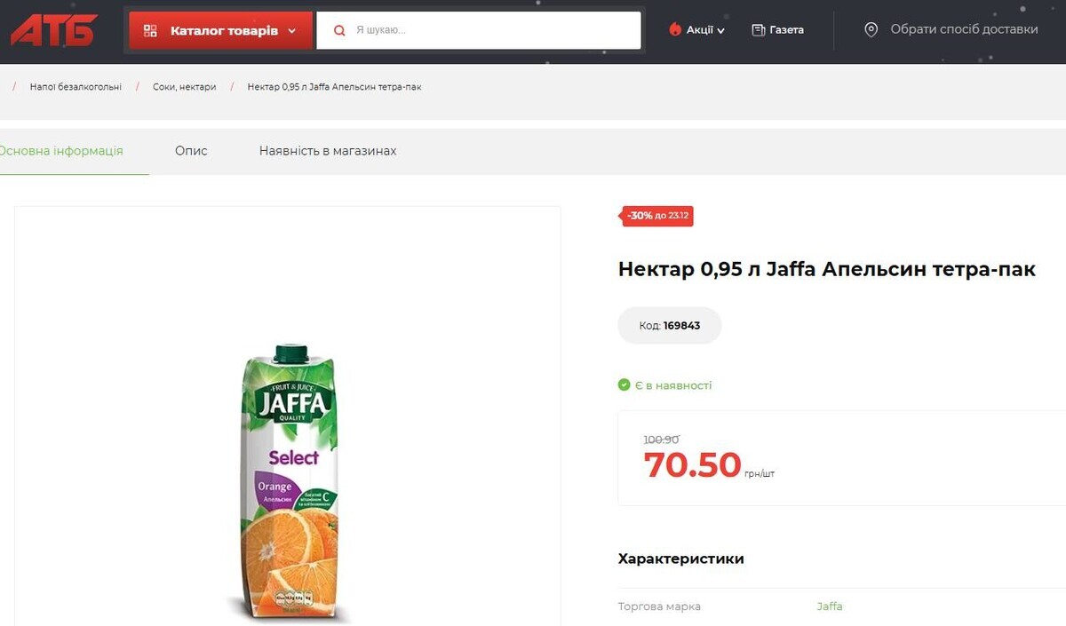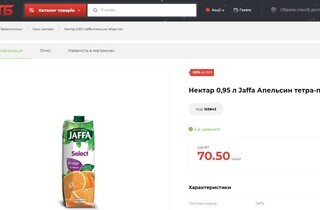 | Сік апельсиновий Jaffa 1 л | 70,50 грн за 1 л | 70,50 |