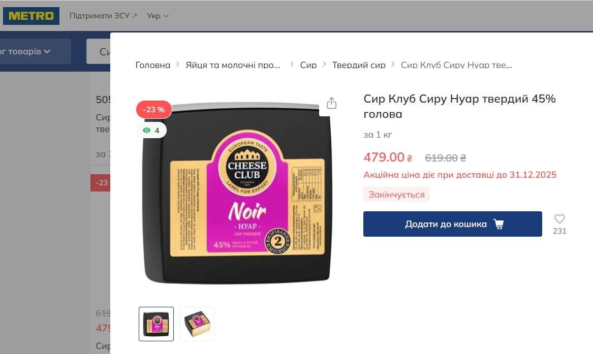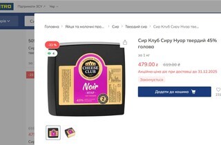| Сир твердий, 0,3 кг | 480 грн за кг | 144,00 |