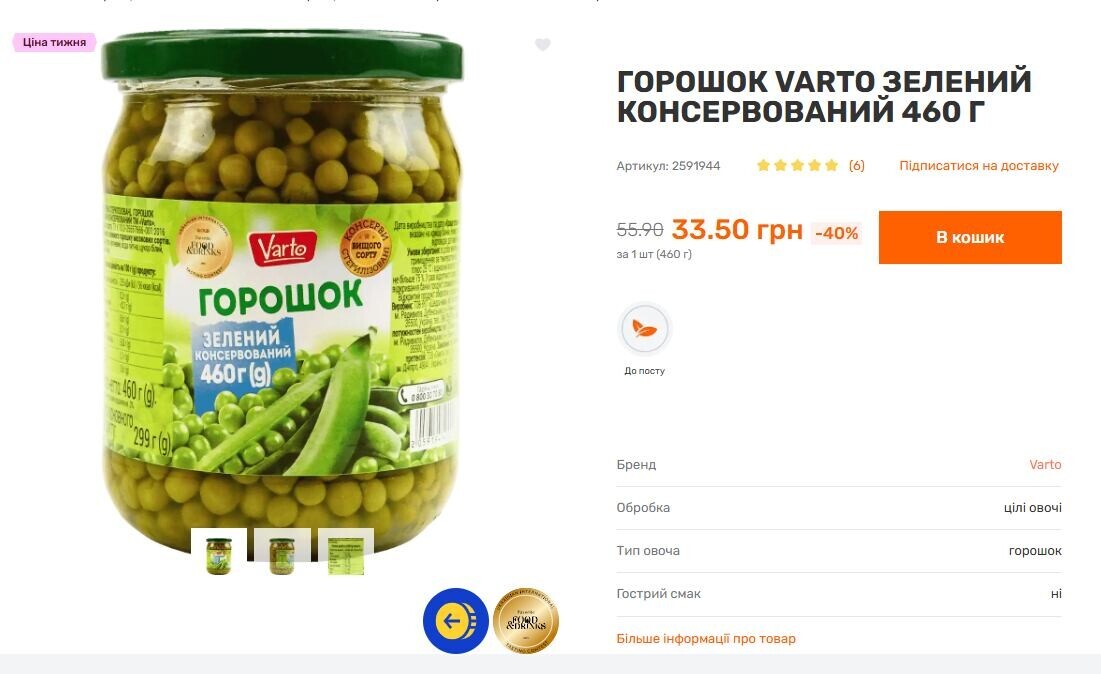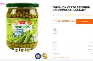 | Зелений горошок, банка 0,5 кг | 33,50 грн за банку | 33,50 |