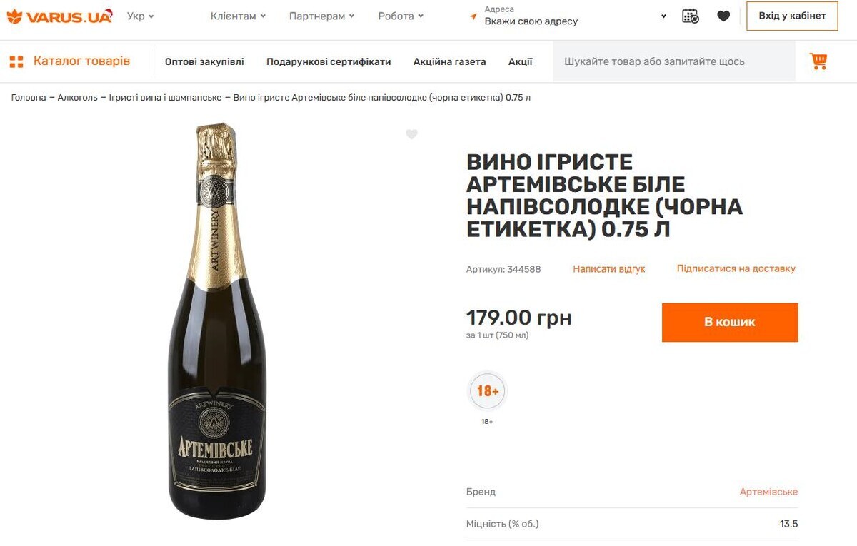 | Шампанське «Артемівське», 0,75 л | 179,00 за пляшку | 179,00 |
