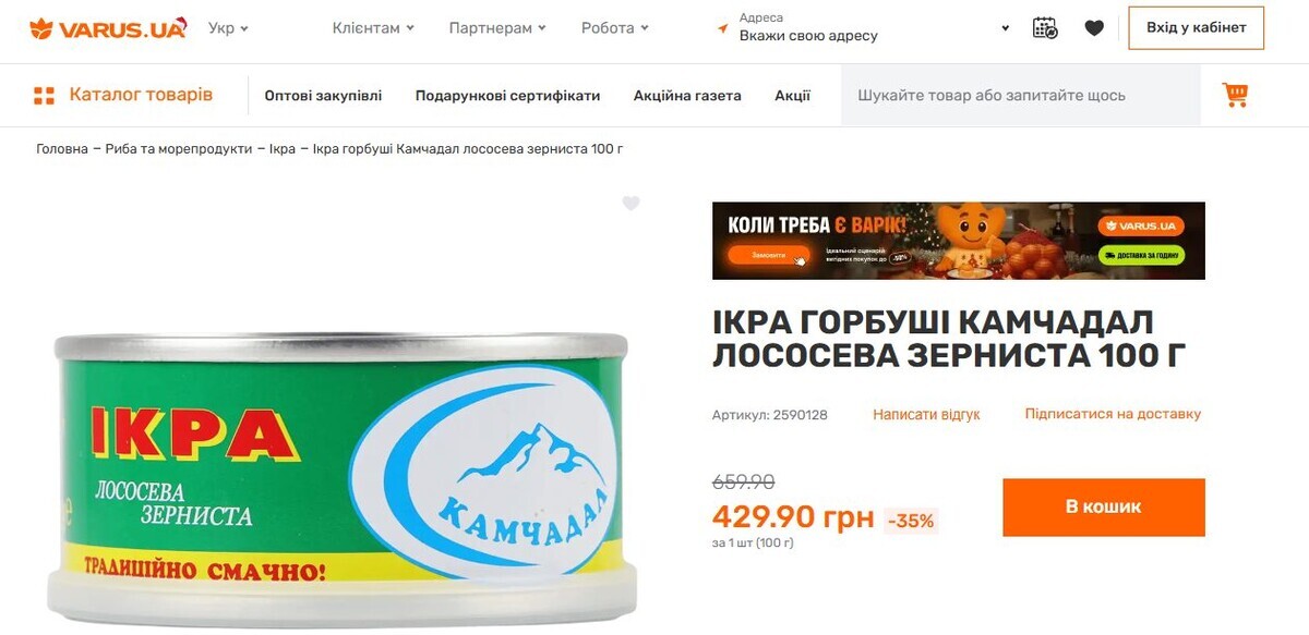 | Ікра червона, 0,1 кг | 429,90 за бан. | 429,90 |