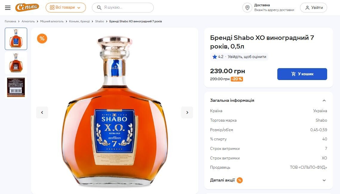 | Бренді «Шабо», 0,5 л | 239,00 грн за пляшку | 239,00 |