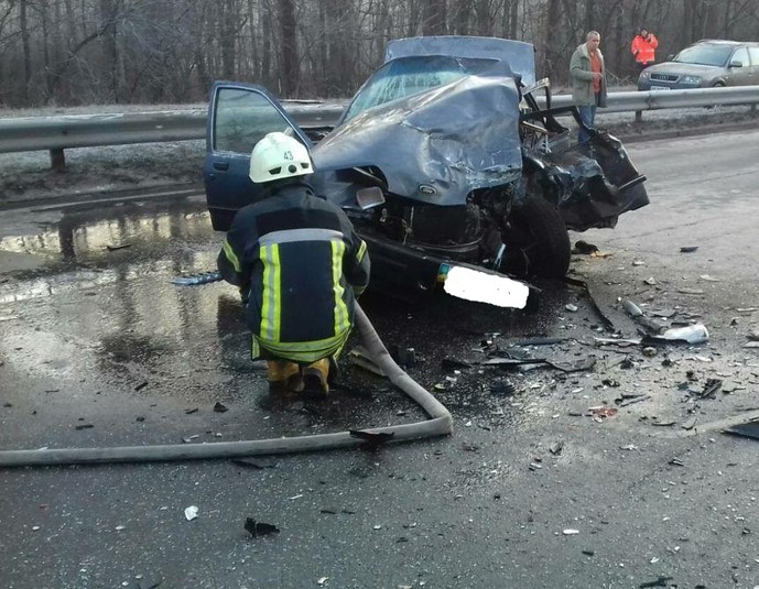 У результаті зіткнення водій автомобіля Ford загинув на місці. За допомогою гідравлічного та пневматичного інструментів рятувальники дістали тіло чоловіка з понівеченого авто.