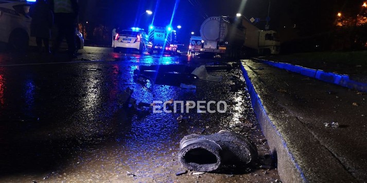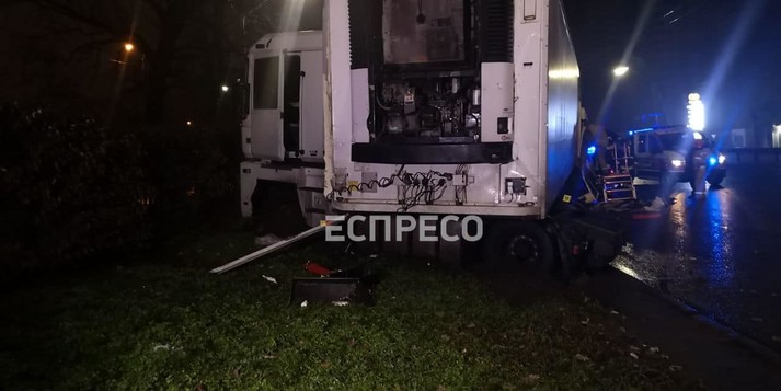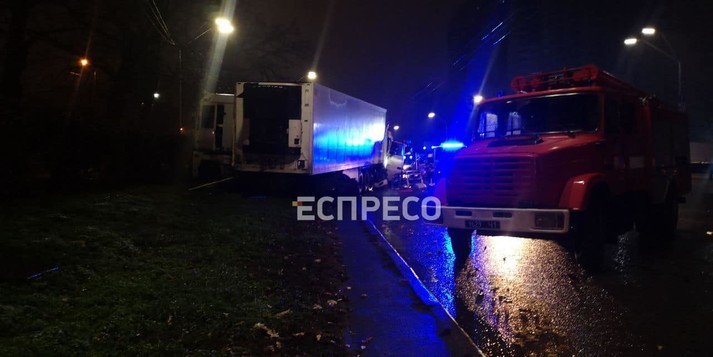 У ніч на середу, 2 грудня, у Святошинському районі столиці автоцистерна-бензовоз DAF протаранила припарковану в правій смузі вантажівку Renault Magnum, водій якої відпочивав.