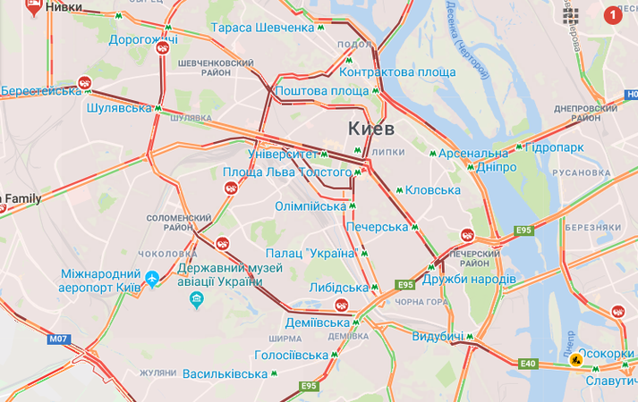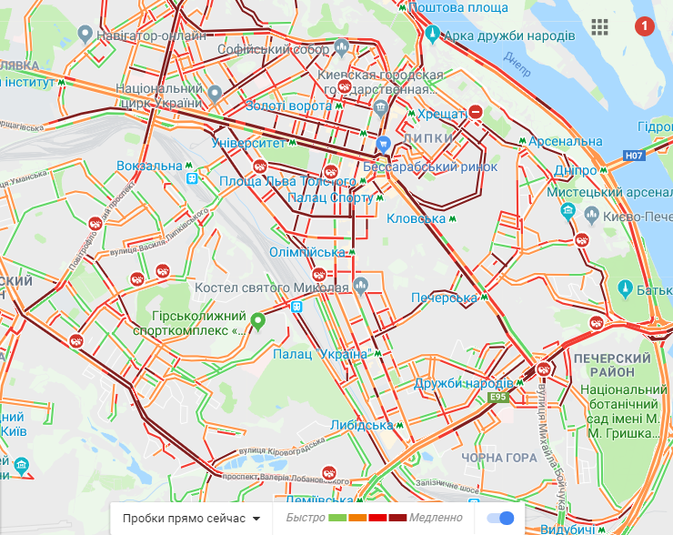 Найбільш складна ситуація спостерігається в центрі столиці. Як видно, дуже повільно рухається транспортний потік в районі вулиці Саксаганського, Еспланадної, на бульварі Лесі Українки, на вулиці Мечникова, Круглоуніверситетській, Інститутській, на Кловському узвозі, Богдана Хмельницького, на Набережному шосе.